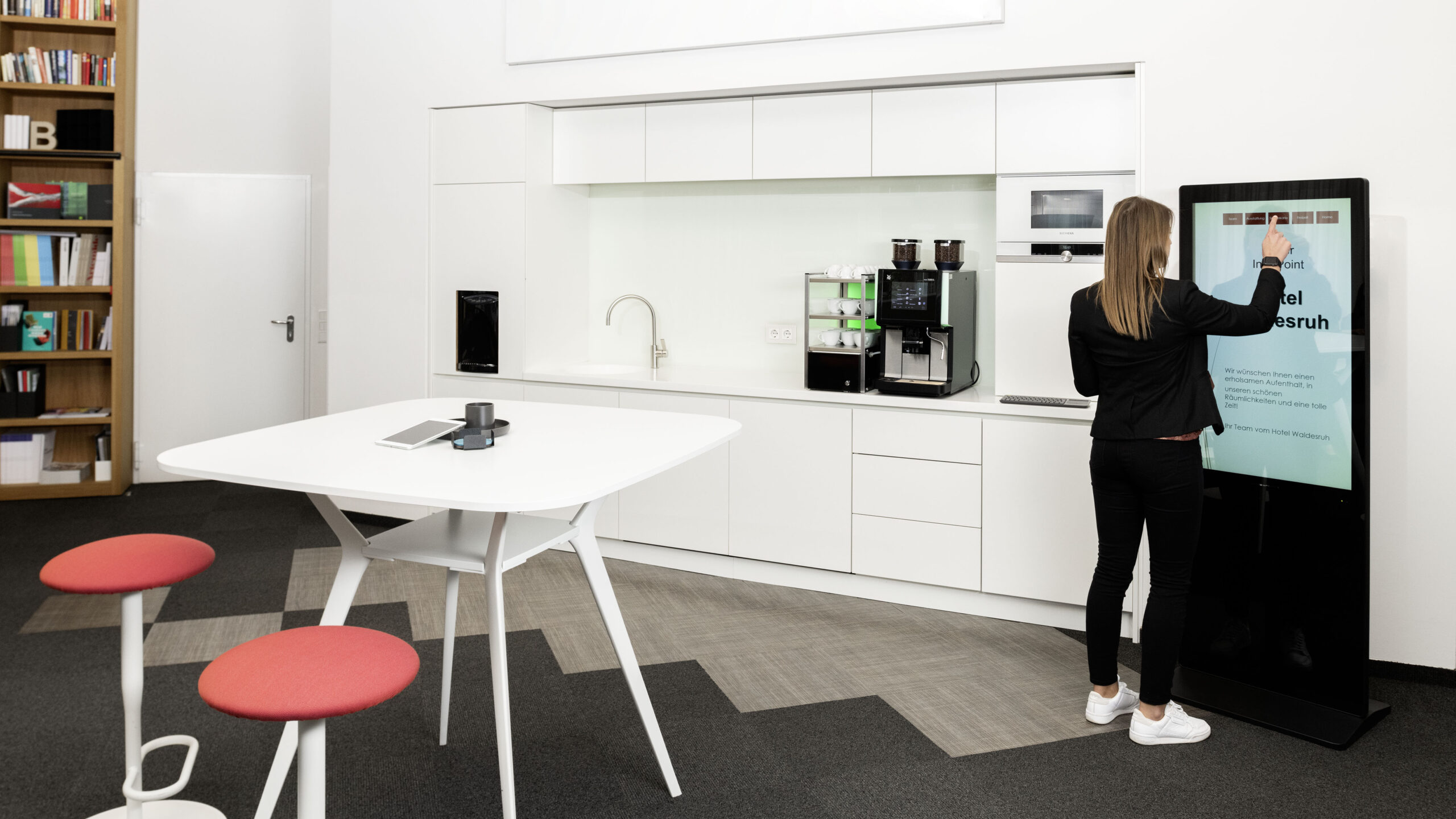 Auch möglich: Self-Services in Kantine, im Lager oder für die Raumbuchung. So werden Wartezeiten reduziert und Personalressourcen geschont. Die interaktive Gestaltung von Workspaces, Aufenthaltsbereichen und Ruhezonen schaffen ein angenehmes Ambiente und eine moderne Atmosphäre.